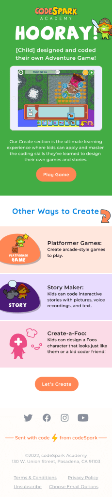 As part of the new onboarding experience, I also implemented a series of event-based emails that triggered whenever a child completed a milestone in the app.